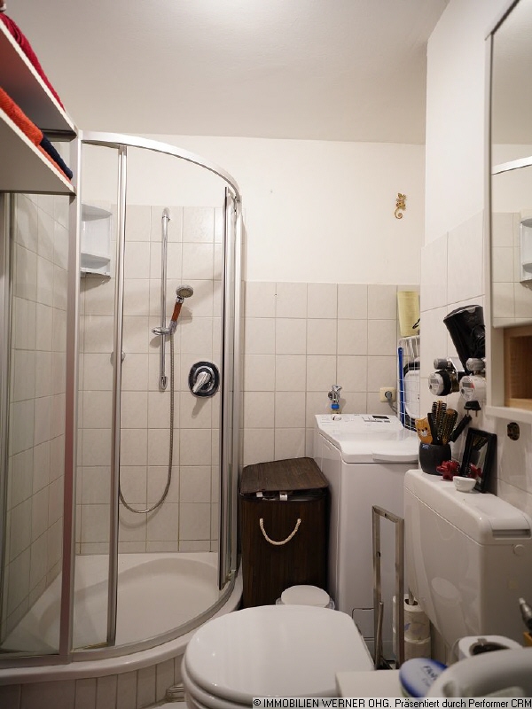Gleich rechts gelangt man in das Badezimmer, welches zeitlos in Weiß gefliest und sehr gepflegt ist. Neben der Dusche gibt es hier auch einen Anschluss für die Waschmaschine – sehr praktisch!